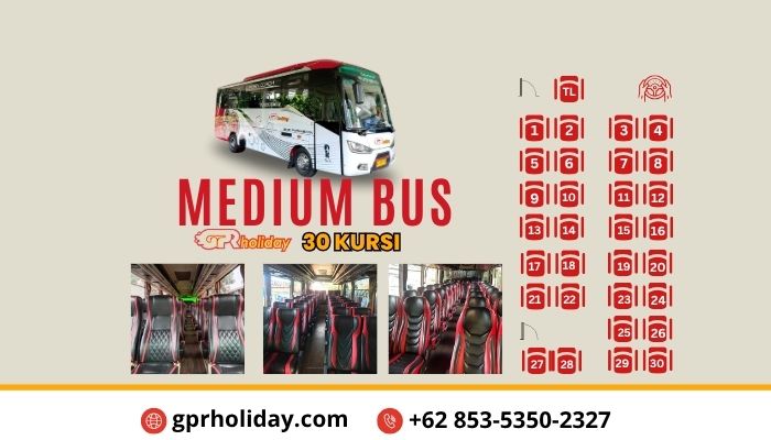 - Medium Bus: Mampu menampung sekitar 25-35 orang. Pilihan tepat untuk rombongan sekolah atau kantor yang tidak terlalu besar.
